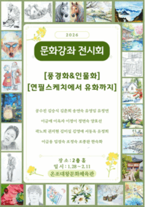 건강교육라이프스타일문화사회생활 온조대왕문화체육관, 회원 그림 전시회 개최 By 김운채 기자 - 2026년 2월 10일 0 1 Facebook Twitter Pinterest WhatsApp 강동구도시관리공단(이사장 이상철) 온조대왕문화체육관은 문화강좌 회원들의 예술적 성과를 공유하고 지역 주민들에게 문화 향유의 기회를 제공하고자 「문화강좌 회원 그림 전시회」를 개최한다. 이번 전시회는 2026년 1월 28일(수)부터 2월 11일(수)까지 온조대왕문화체육관 2층 홀에서 열리며, 문화강좌 회원들이 직접 그린 다양한 작품들이 전시될 예정이다. 제공:온조대왕문화체육관